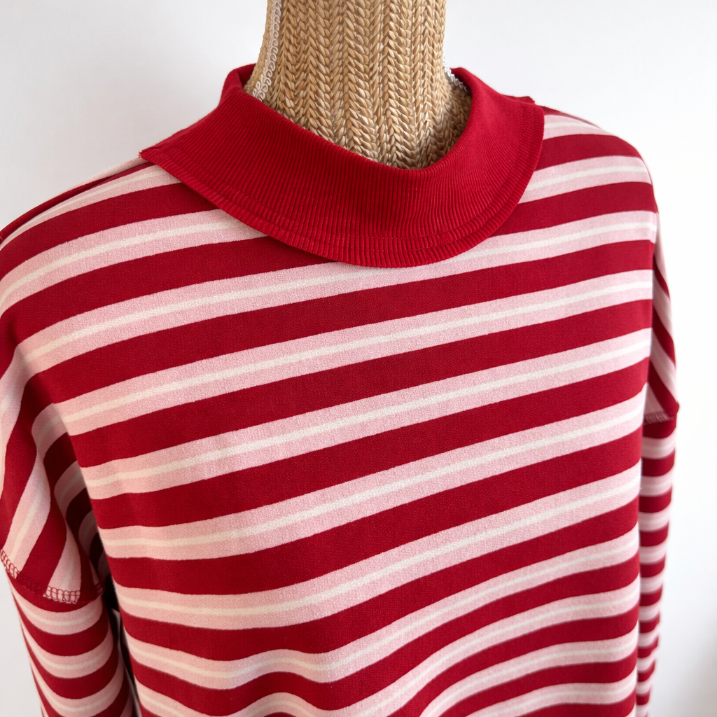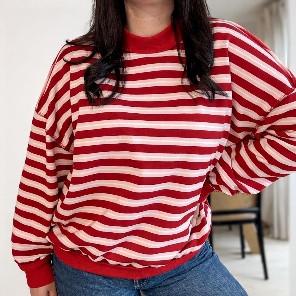 Avec ses rayures chaleureuses, ce sweat apporte une touche joyeuse et rétro à n’importe quelle tenue, tout en restant facile à porter au quotidien.